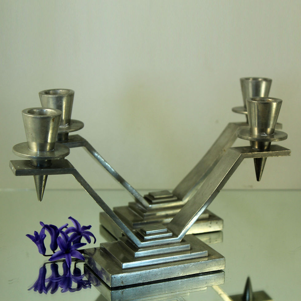 English F.M.S. Pewter. Pair of Art Deco Pewter Double Candelabras
